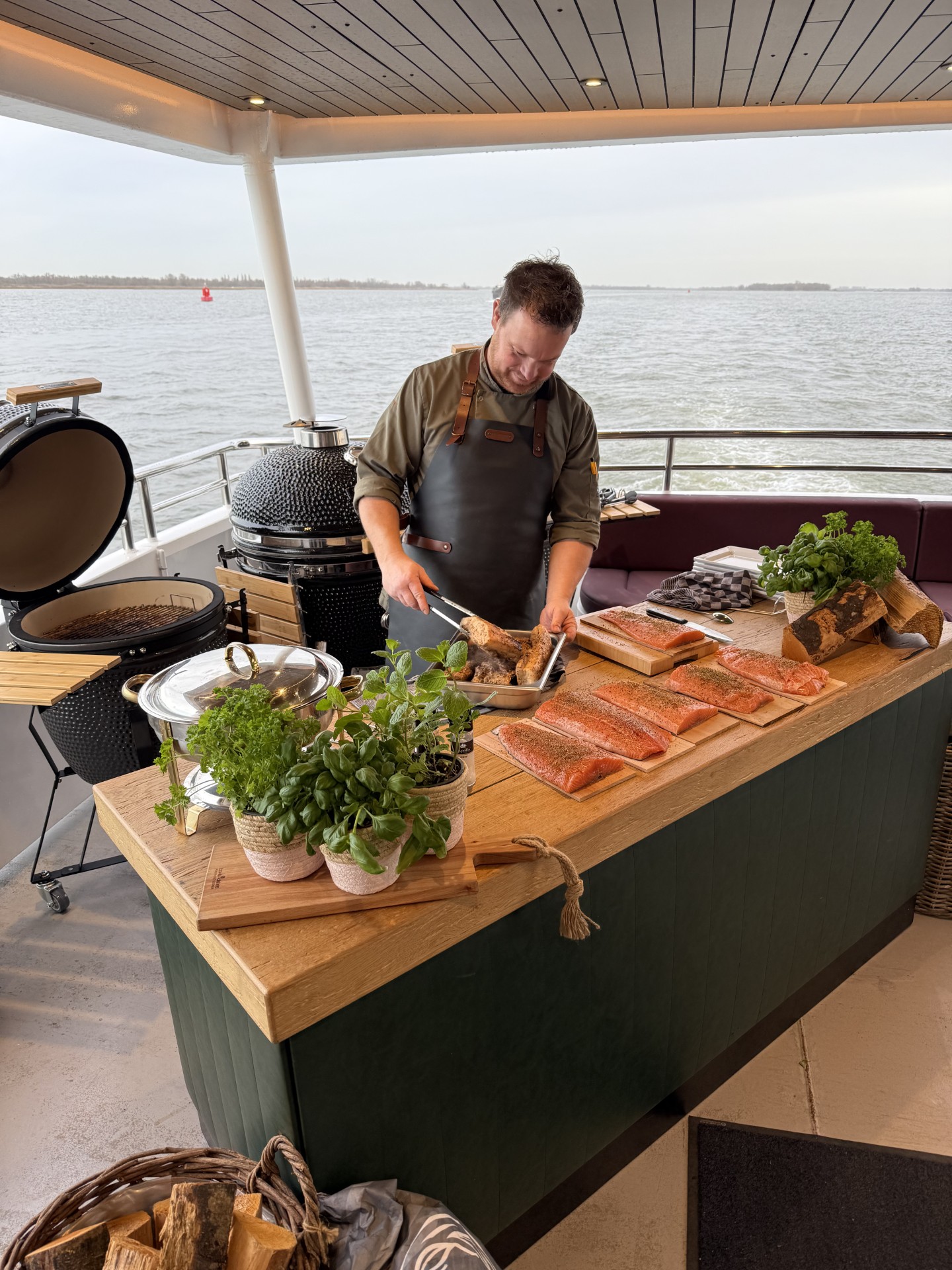 De chef grilt voor uw ogen de lekkerste stukken vlees van de barbecue op het buitendek van het schip. Binnen in de verwarmde salon presenteren we nog aanvullende koude gerechten en uiteraard frietjes.